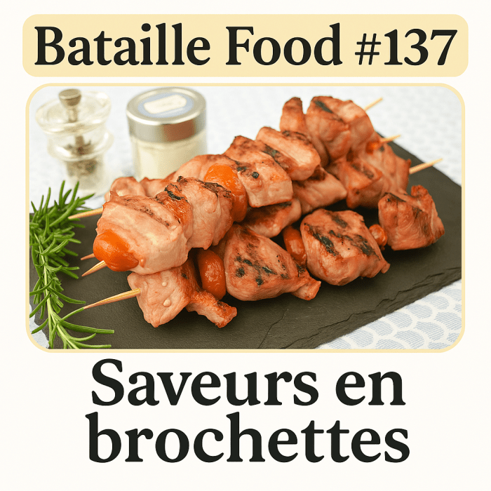Aujourd’hui est le rendez-vous de la Bataille Food #137 dont j’ai choisi pour thème « Saveurs en brochettes ». Nathalie du blog Les Food Amour m’a passé le flambeau. Ce jeu a été créé par Jenna du blog Bistro de Jenna et Hélène du blog Keskonmangemaman ? est l’administratrice du jeu et de la page Facebook.