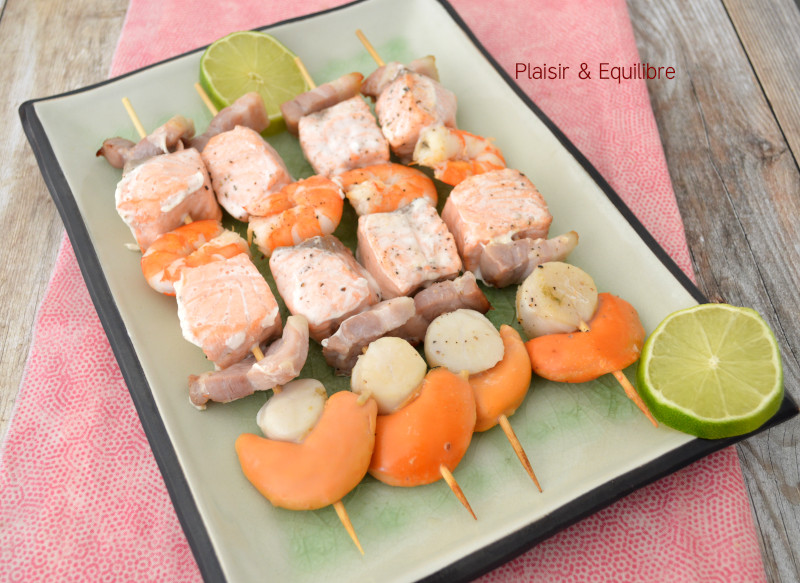 Pour réussir des brochettes au poisson, il est important de choisir des poissons à la chair ferme comme le saumon, le cabillaud, le thon, la lotte. Je vous propose ici des brochettes de la mer, composées de saumon, de noix de Saint Jacques et de crevettes auxquelles j’ai ajouté des morceaux épais de lard fumé qui apportent une belle saveur fumée et salée. J’avais prévu une cuisson au barbecue mais finalement je les ai cuites au four. Une cuisson à la plancha ou à la poêle conviendra également. Un trait de jus de citron au moment de servir et vous vous régalerez avec ces brochettes de la mer !