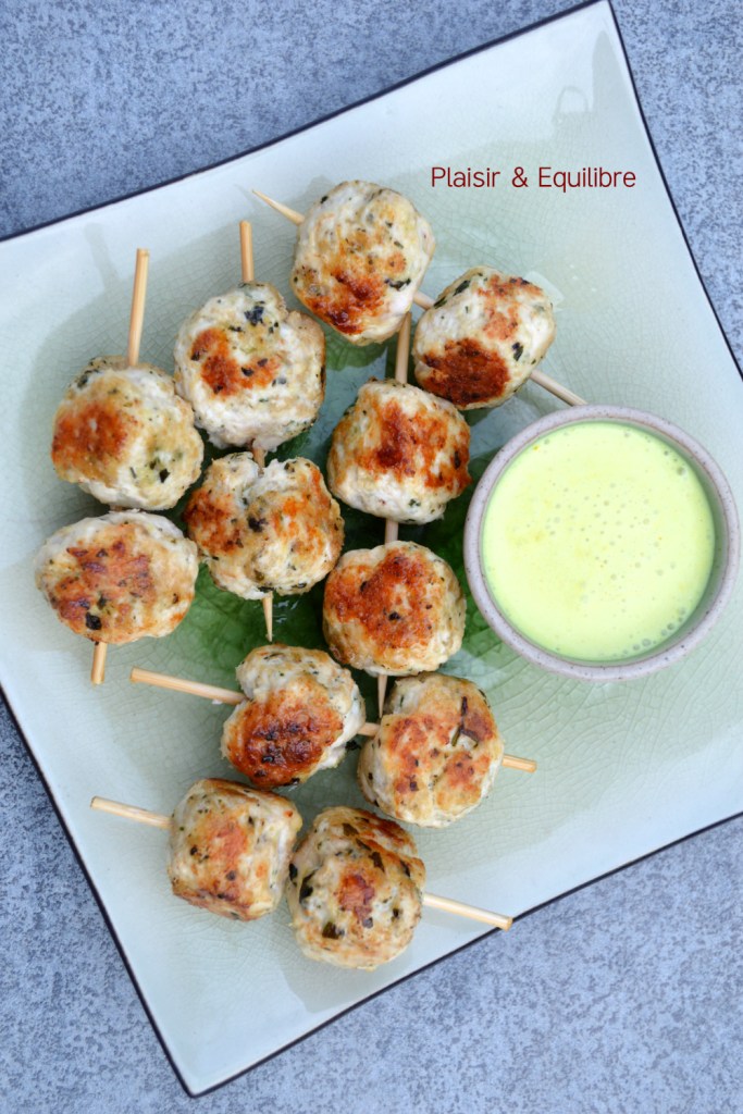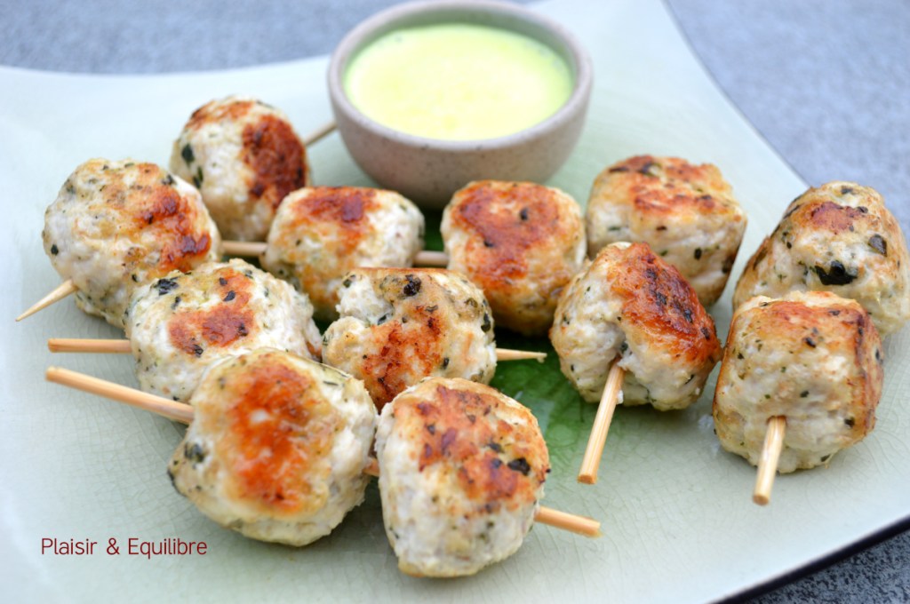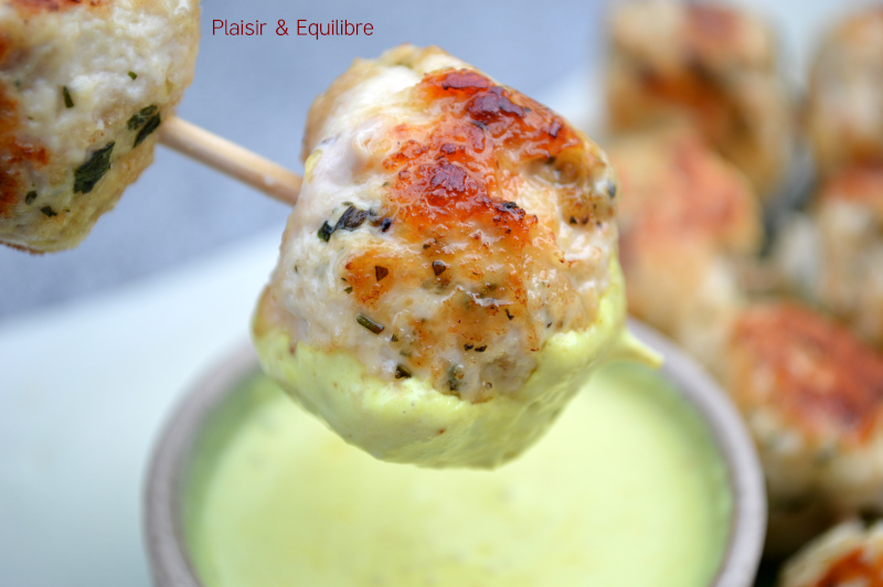 Servir les brochettes de boulettes de poulet avec la sauce coco curry.