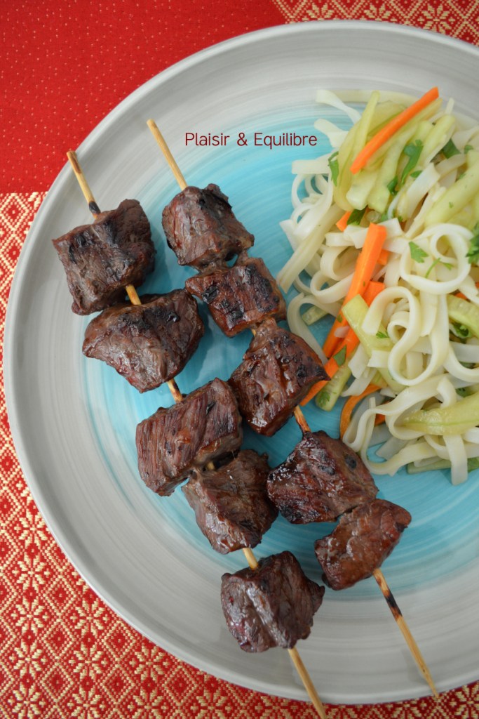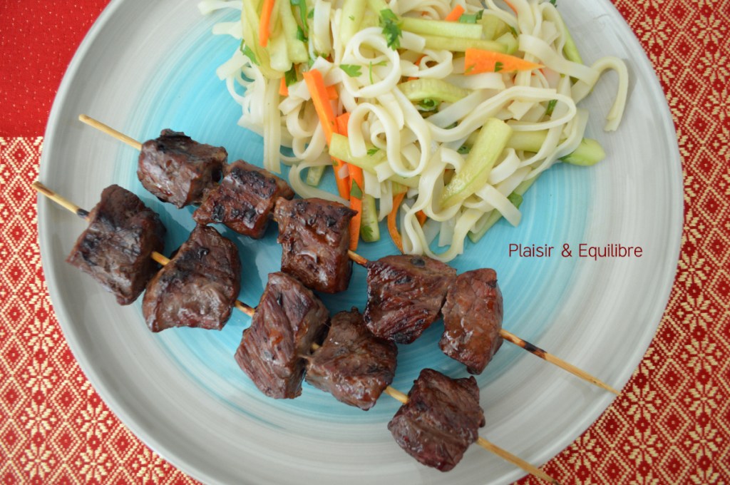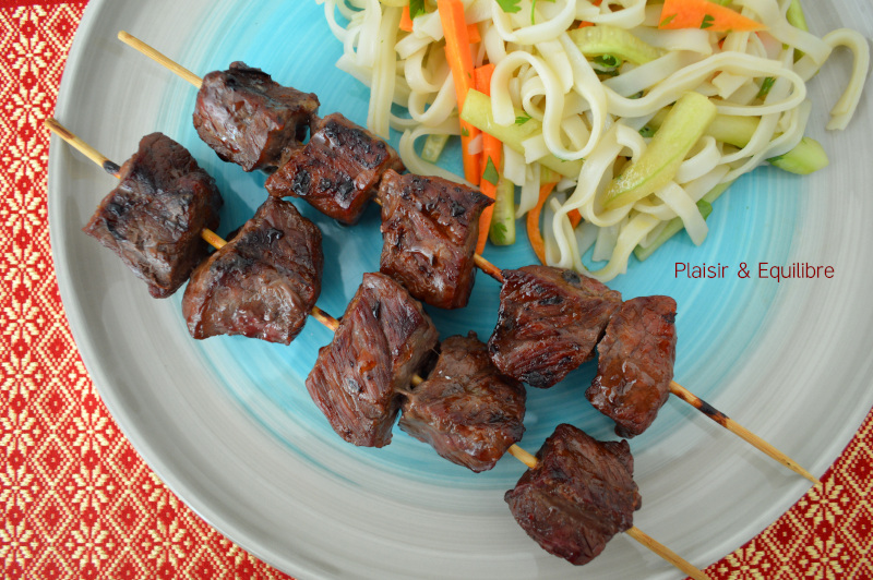 Avec la chaleur du moment, j’ai choisi d’accompagner ces brochettes de bœuf teriyaki d’une salade thaïe rafraîchissante, à base de nouilles de riz, concombre et carottes, parfumée à la coriandre et à la menthe, et relevée d’une délicieuse sauce thaïe. Vous pouvez bien sûr la remplacer par du riz ou des nouilles sautées, selon vos envies.