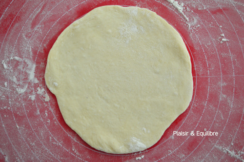 Étaler chaque boule en un disque de 15 cm de diamètre en veillant à bien fariner la pâte pour qu’elle n’attache pas.