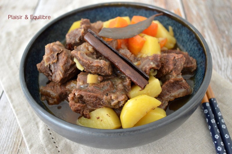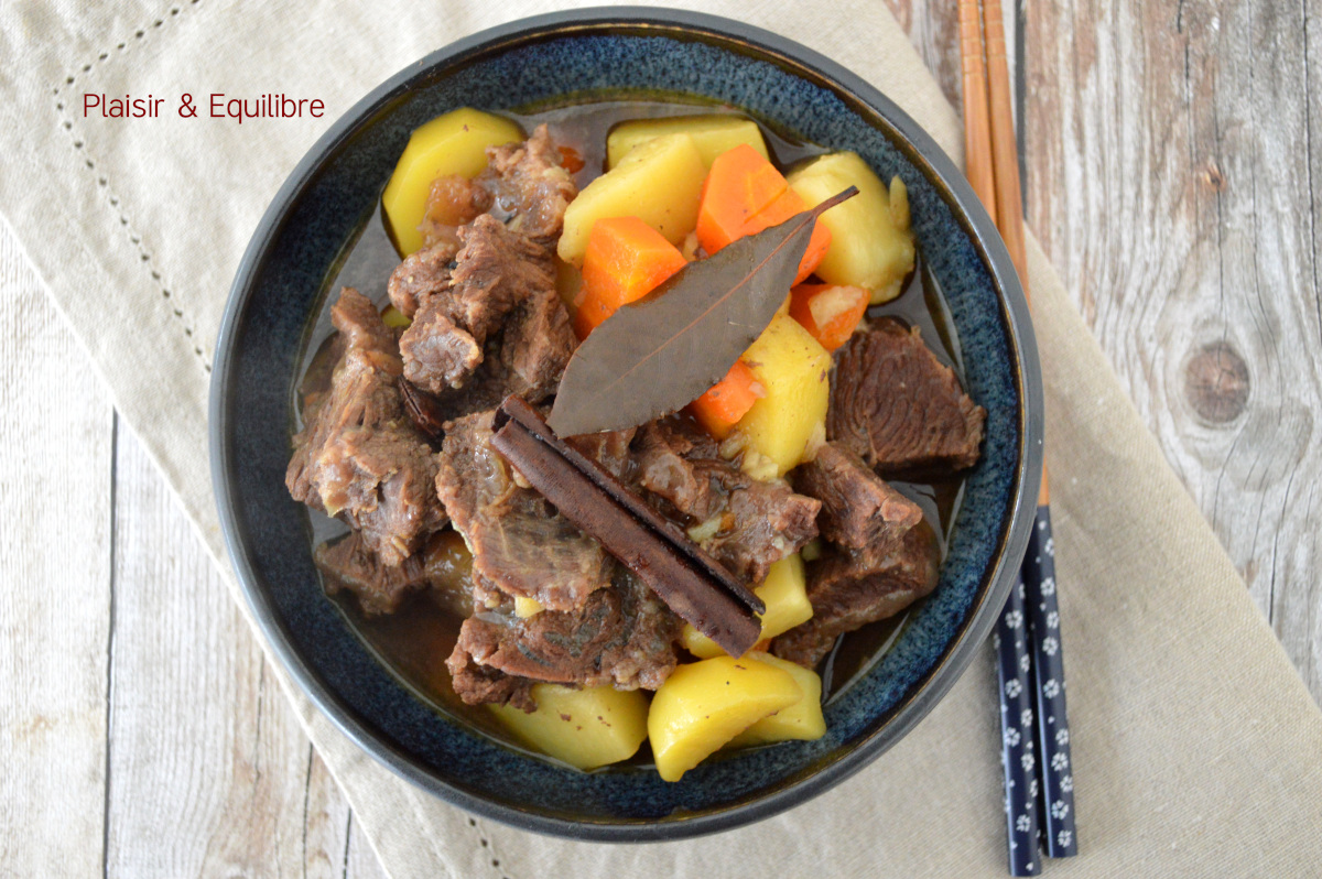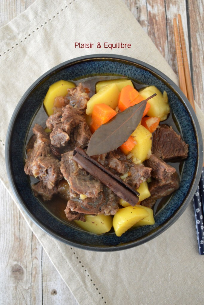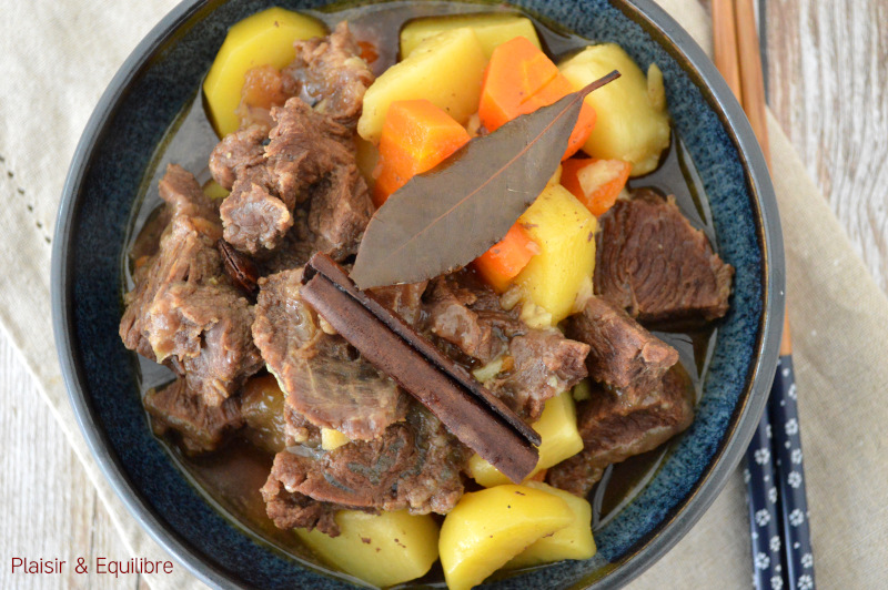 L’année du Cheval de feu a débuté et pour fêter ce Nouvel An lunaire et l’arrivée du week-end, vous apprécierez sans doute un petit mijoté. Le ragoût de bœuf chinois aux pommes de terre se compose de bœuf à braiser qui cuit longuement dans un bouillon très parfumé avec des épices comme l’anis étoilé et la cannelle et du vin de Shaoxing et de la sauce soja. En fin de cuisson sont ajoutés des pommes de terre et des carottes. La viande est extrêmement tendre et riche en saveurs. Nous avons mangé ce ragoût uniquement avec les légumes qui le composent, vous pouvez l’accompagner aussi de riz ou de nouilles chinoises. Vous pouvez également cuire ce ragoût à l’autocuiseur pour diminuer le temps de cuisson. Ce plat pourra facilement être congelé une fois refroidi.