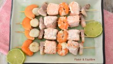 Pour réussir des brochettes au poisson, il est important de choisir des poissons à la chair ferme comme le saumon, le cabillaud, le thon, la lotte. Je vous propose ici des brochettes de la mer, composées de saumon, de noix de Saint Jacques et de crevettes auxquelles j’ai ajouté des morceaux épais de lard fumé…