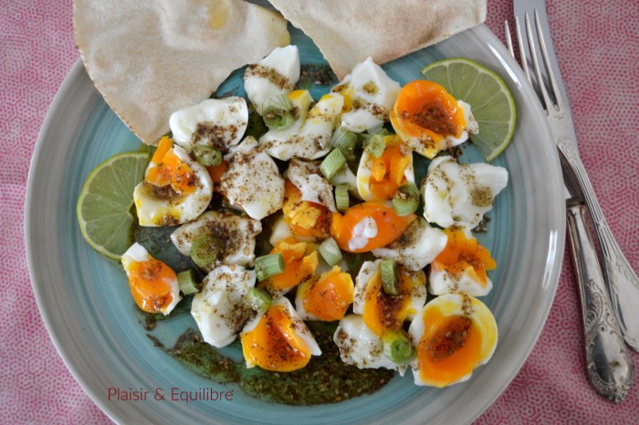 Asperges roulées brick, jambon et œuf poché sur salade d’épinards