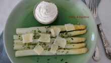 J’avais reperé la recette de Manue qui proposait des asperges blanches vapeur à la mousse de parmesan, simplement je n’avais pas fait attention que cette recette devait se faire la veille. Mes asperges étaient bien fraîches et je comptais les faire pour le soir même. J’ai donc changé pour une chantilly de parmesan. Et bien…